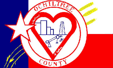 Ochiltree County employs the Texas State Flag with its own symbols: a white disc bearing the county name between two red rings charged with symbols representative of the county. Within the inner ring is the red outline of a heart, inscribed "Wheatheart of Nation" in white script. Inside the heart are blue representations of a cow, oil drilling equipment, and grain storage and processing facilities. Passing behind the disk are three golden wheat stalks. The Lone Star has been placed in its usual position, but overlaps the disc and is outlined in red.