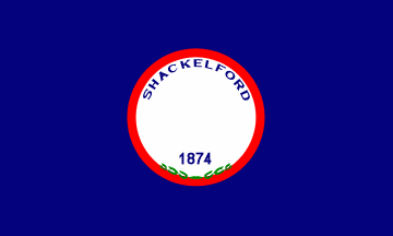 About the flag: "On 10 June 1974, during the celebration of the 100th anniversary of the organization of Shackelford County, the Commissioner's Court adopted a flag presented to them by the Lee's Legion Chapter of the Daughters of the American Revolution. The flag has a royal blue field bearing a red ring around a white disc. On the disc appear the inscription "Shackelford 1874" and green leaves, apparently olive branches."