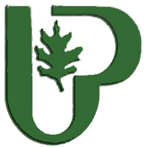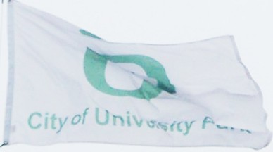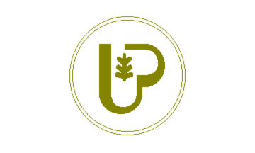 A white flag with the city logo centered, consisting of a gold-edged circle with the conjoined letters U and P and an oak leaf in the center.