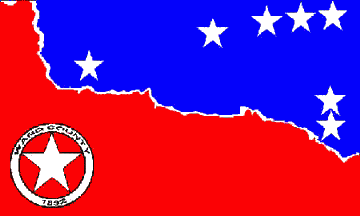 As a result of inquiries regarding the County Flags of Texas, Ward County Clerk Pat V. Finley was motivated to initiate proceedings to design and adopt a flag for the county. The Ward County Historical Commission sponsored a contest open to the general public and received about 65 entries. The winning entry, submitted by Carolyn Hunter, displayed a blue map of the roughly triangular county with white stars geographically placed to represent each of its seven cities and towns. The remainder of the field was red, with a white strip representing the Pecos River separating the two main sections of the flag. The Commissioners' Court added the white ring and star, taken from Ms. Finley's entry, to the lower left of the flag before unanimously adopting this design on 26 August 1991.