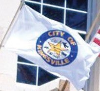 A white flag with the seal in the center featuring a yellow star on a white field inside a blue ring.
