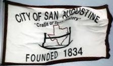 A white flag with a black border, in the center a map of Texas before a barred gate, the name and slogan above and the date of founding below, all in black.
