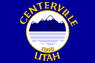 A blue flag with a central gold-rimmed white disc, bearing an image of snow-capped mountains reflected in a lake. On the disc is written 1848 in gold, and around it in gold, CENTERVILLE and UTAH.
