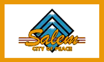 The image was obtained from the website at www.pondtown.org, and shows a sand-color bordered white flag with a central logo showing three squares turned on point, and overlapping to appear as three snow-capped bluish mountains behind each other. Written across them is "Salem" in large script and "CITY OF PEACE" in small capital letters.