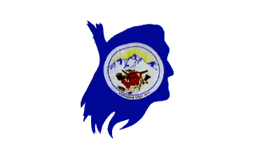 The former flag of the City of Santaquin, Utah, is white with blue Santaquin silhouette faces right and seal-like emblem in the middle of the silhouette and of the flag. the emblem