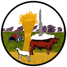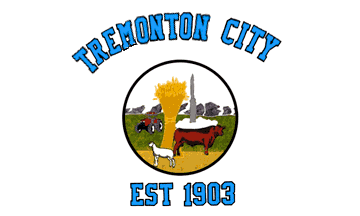 The flag of the City of Tremonton, Utah, bears the City's original logo/seal. An adoption date is not available, but it was adopted long before 1985. The design was selected as a result of a contest held at the local high school, Bear River High School. Unfortunately, the name of the artist is not available. The drawing depicts elements which represent the heart of our community: our beautiful mountains; grain, tractor, sheep and cattle which represent the farming/ranching industry; and a rocket representing nearby ATK Thiokol, who, for many years, has built the rocket booster for the NASA space program and has provided employment for many of our citizens. Photo and information thanks to Shawn Warnke, Tremonton City Manager.