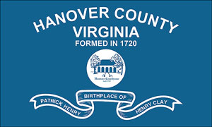 A blue flag with a blue on white seal centered, the name, state and date above in white, and a ribbon with "PATRICK HENRY / BIRTHPLACE OF / HENRY CLAY" written on it.