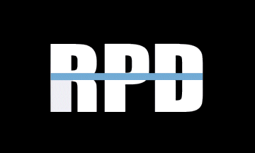 The current flag of the Roanoke Police Department, as illustrated at photos.vachiefs.org/VACP-Conferences/2014-VACP-Annual-Conference/Opening-Ceremonies/, features the department's initials (RPD) in white block letters on a black field. The letters are bisected by a thin light blue line, likely representing the idea of the police as "the thin blue line" against