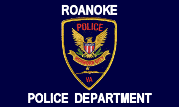 The former flag of the Roanoke Police Department, as illustrated at photos.vachiefs.org/VACP-Conferences/2012-VACP-Annual/2012-08-14-VACP-Awards-Banquet/i-sHhPJ4N, features the department's shoulder patch centered on a dark blue field. Above the patch in white letters is the word "ROANOKE," with the words "POLICE DEPARTMENT" below the patch in similar letters.