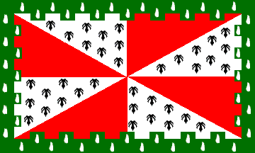 Description: The Loudoun County, Virginia, flag is a banner of the county arms devised by the English College of Arms in 1968. These are based on the arms of the 4th Earl of Loudoun, who was a colonial governor of Virginia after whom the county was named. They are blazoned as gyronny of eight gules and ermine, a bordure embattled vert goutty argent. The green bordure is intended to represent the county's agricultural economy and the white drops are milk, denoting the dairy industry.
