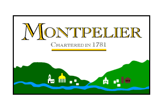 The NAVA image at www.nava.org/ and shown in the American Flag Survey (2004) and American City Flags (Purcell, 2003) is a ~2:3 white flag with a drawn landscape and lettering in a rectangle delimited by a thin black line, leaving a white bordure overall. The said landscape shows a hill and river fork scene, the tributary's left bank being medium green and the rest dark green, contrasting with the light blue river; dotted along the farthest banks of the main river small outlines of local architectonical landmarks and some token non-descript housing. Above, "Montpelier" set in Caslon Open Face capitals, black with golden yellow cutouts, the "M" much larger, and below it, much smaller and plain b/w "Chartered in 1781" underscored with a golden yellow over black stroke.