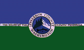 Horizontally divided blue over green, with the county seal centered. Along the join of color a white ribbon stating THE HEART OF THE OLYMPIC PENINSULA
