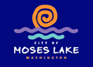 A blue flag with two wavy lines in the center, purple over pale blue, arising from the purple line an orange spiral, and the name below in white, state name in orange.