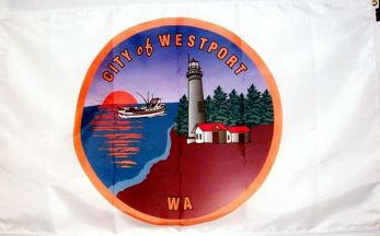 A white flag with the seal in the center depicting a sunset scene with a fishing boat and lighthouse.