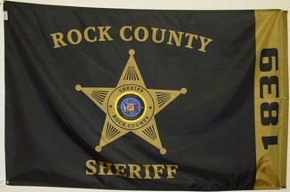 A dark brown (or black?) flag with a gold vertical stripe along the fly with the date 1839 written sideways; on the main field a sheriff's badge with arms in full color, and ROCK COUNTY above and SHERIFF below in gold.