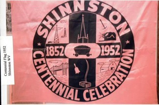 A pink flag with what is likely the city seal, amended to include the words CENTENNIAL CELEBRATION around the bottom.