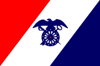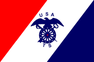 Army Transport Service, circa 1917 - 2:3, divided diagonally red, white, and blue, with the Army Quartermaster Corps badge on the center, the letters USA (for United States Army) above the badge and TS (for Transportation Service) below. This flag is shown in the 1917 National Geographic flags article [gmc17].