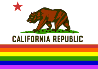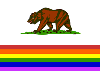 This flag has the bear and star from the state flag on the rainbow field with red stripe at the bottom; no mention was made of the inscription, but as an integral part of the state flag, it was probably there, too. Some examples of how it might have looked may be found at cltampa.com/dailyloaf/archives/2012/06/05/proposition-8-marriage-equality-fight-headed-for-the-supreme-court#.UiMAkX_cDm0 and leftyliberal.com/lgbt-rights, but the red and purple stripes are shown narrower than the others, so the charges are not positioned where they ought to be on a complete rainbow flag.