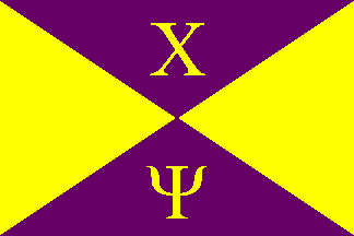 Chi Psi was founded at Union College in Schenectady, New York, in 1841, the eighth Greek letter social fraternity in the United States. Its flag is divided per saltire, purple and yellow, representing an hourglass, with the Greek letters of the name in yellow on the purple areas of the field.