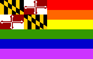 This is simply the Rainbow Flag with the Maryland State Flag in the canton, which I saw again in nylon, in 2'×3' and 3'×5' (91 cm × 155 cm). A rather busy flag, but at least nominally heraldically correct.