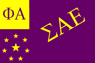 Sigma Alpha Epsilon was the only social fraternity founded in the South before the Civil War. It was established by eight students at the University of Alabama in 1856. The flag is purple. On a yellow canton the letters phi and alpha are inscribed in purple. Below the canton, in lower fly, is a cluster of eight yellow stars in a circle (seven in a ring and one in the center). In the center and fly the Greek letters of the name are inscribed diagonally, rising toward the fly. The canton is officially described as the size and shape of the canton in the U.S. flag, but pictures show it approximately 1/3 the fly and 1/2 the hoist. The stars, which represent the eight founders, are variously all the same size or with the center star larger.