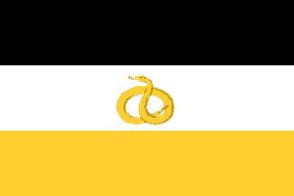 Sigma Nu was founded at the Virginia Military Institute in 1869. The flag is a horizontal tricolor, black, white, and gold, with a gold rattlesnake from the coat of arms on the center of the white stripe.