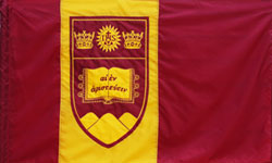 "On a field gules, above a trimount in base or, an open book argent edged of the second, thereon an inscription αιεν αριστευειν (Ever to Excel); on a chief sable between two crowns composed of alternate crosses patté and fleur-de-lis or, the badge of the Society of Jesus, azure and or.As mentioned, the arms on the flag are in maroon and gold only. Boston College is a university operated by the Jesuit order, with its main campus in Newton, MA, a suburb of Boston.
