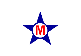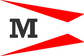 white burgee with a blue and red emblem on the center reading M and
