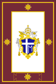 Coat of Arms being replaced with the papal personal Coat of Arms (blue, golden cross and letter M) of