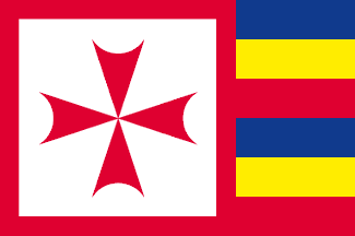 Flag: | Ratio 2:3, the hoist two-thirds a red Maltese cross on white with a red border, the fly third six horizontal stripes blue-yellow-red-blue-yellow-red. |
