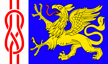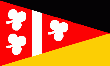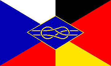 The one for the Czech-German meeting joining together the Czech national flag and the DGF flag, with a blue lozenge (fimbriated yellow) with a yellow knot in the centre.