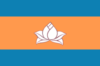 The flag was proposed at a website in Vietnamese by a group of Vietnamese students from the USA, Canada and France. The flag is horizontally divided blue-orange-blue (1:2:1), with a white lotus flower, fimbriated brown, in center of orange field. Blue color stands for the sky, sea and peace. Orange stands for Vietnamese people and is actually described as yellow (perhaps meant to be "saffron color"), which is said to be the traditional national color. Lotus is the national flower and its white color and brown fimbriations recall the emblem of the Hoa Hao religious community, which is a white lotus on brown field - actually, the form of lotus on the flag is the same as used by the Hoa Hao community in Vietnam, which suggests that the flag designers, at least some of them, might be the Vietnam-born followers of Hoa Hao (the form of lotus used by the followers in diaspora differs).
