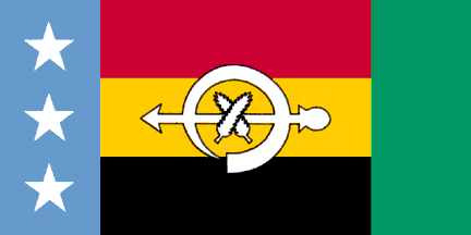 The Penama Province (former District of Ambae-Maewo and District of Pentecost) flag is vertically divided approximately 1-3-1, blue with three vertically arranged white stars on the left, green on the right. The central part is horizontally divided 1-1-1 red-yellow-black with a white boar's tusk and pin and two crossed wheat ears in the centre.