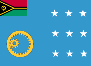 Sanma Province (former District of Santo Malo) flag is light blue, with the national flag (approximately quarter size along the hoist) in the canton. The fly bore nine white stars in three rows of three, and the lower fly carried two yellow cogwheels, one inside the other.