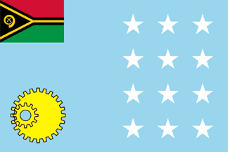 Sanma Province (former District of Santo Malo) flag is light blue, with the national flag (approximately quarter size along the hoist) in the canton. The fly bears twelve white stars in four rows of three, and the lower fly carries two yellow cogwheels, one inside the other.