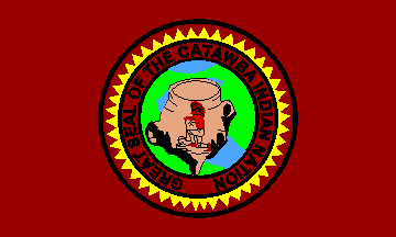 The Catawba are known for their beautiful pottery, which serves as the principal device on the tribal seal and flag. The seal of the Catawba Nation dates from 1974-75 when the Executive Director of the Catawba needed official stationery. Wanda George Warren, a high school student, designed an appropriate seal for the Tribe in her commercial art class. She contacted