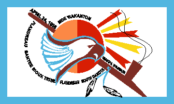 adopted its constitution. On the other side of the disk, along the top of the pipe, is "WAKPA IPAKSUN", the Wahpekute band's name in its native tongue. Arching along the top of the disk is "MDE AKANTON", the name of the Mdewakanton band in Dakota. Arching behind the head of the eagle is "FLANDREAU SANTEE SIOUX TRIBE, FLANDREAU, SOUTH DAKOTA". All lettering on the flag is black.