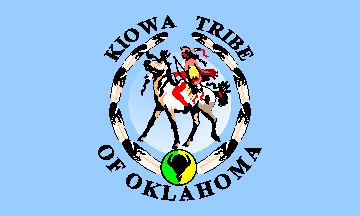 The pale blue flag of the Kiowa bears the tribal logo in the center (Letter, Charlotte Redbird, Tribal Administrative Secretary, 15 Feb. 1995). The logo shows a Kiowa warrior of the Plains surrounded by a ring of ten white-and-black eagle feathers representing the ten Kiowa Medicine Bundles (seal provided by the Kiowa Tribal Headquarters).
