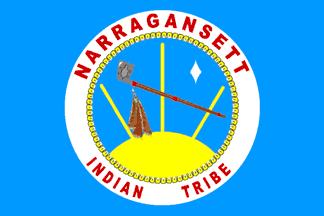 This photograph was taken at the Narragansett Indian Church and shows the Narragansett tribal flag flying *above* the United States flag on the same flagpole. It is a pale blue field, with the tribal seal centrally located. A detail of the seal may be seen on the Narragansett tribe web site: www.narragansett-tribe.org (with music). On this page, there is a different flag design, described as the "pow wow flag": www.narragansett-tribe.org/newsletter.htm.