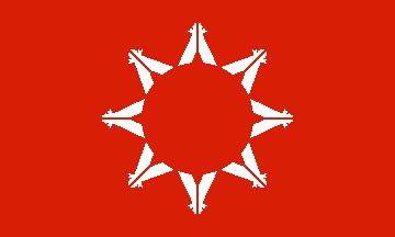The Oglala Lakota (Oglala Sioux) of Pineridge, South Dakota have a flag with eight white tipis arranged in a circle, bases inward so they form a star, on a red field. The eight tipis each represent one of the districts of Pineridge where the seven tiyospayes (family groups, bands) settled after being interned on Pineridge in ~ 1890 by the U.S. government. They are arranged in a hocoka, camp circle. The circle is significant of unity and continuity. The red color has many significant spiritual connotations. It is the color of the paint used to decorate the face and hair parting in ceremonies. It is the color of the cloth used to wrap offerings to Wankantanka, God. It is the color that designates the direction north. An especially great day or holy day is a red day. To walk the good red road is to lead a morally upstanding life.