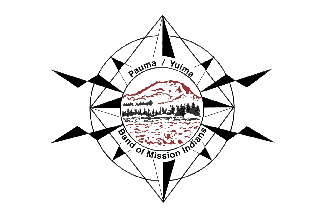 Pauma's flag appears in the front of the Tribal Hall and also at the Education Center of the Palomar College on the reservation. It is a white flag bearing the tribe logo in black and dark red in the center.