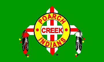 The Tribe's seal appears on the medium green background of the flag. The seal consists of a black-edged white cross with pointed ends pointing in the four cardinal directions. The Poarch Creek call the bars of this cross logs". A yellow ring, edged in black, overlays the cross. In the ring curve "POARCH" above and INDIANS" below, separated by small red circles. Within the ring, on the center of the horizontal "log", is "CREEK". The lettering is red, in a red typeface trade-named "Southern". A small black ® appears to the right of the lower end of the vertical "log".