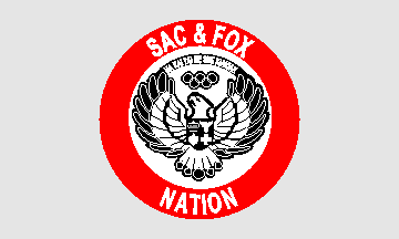 Above the hawk emblem, five Olympic rings recall the great Sac athlete Jim Thorpe, considered one of the finest athletes of all time. A black ribbon arches overhead between the tips of the hawk’s wings. On it appears MA KAI TAI ME SHE KIAKIAK, “Black Sparrow Hawk”, in white (The Sac & Fox Emblem, pamphlet, n.d.). A red band encircling the seal reads “SAC & FOX” above, and “NATION” below, in white. The seal is centered on a white field to form the flag.