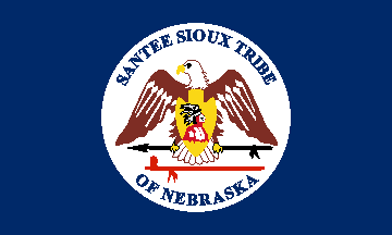 The flag of the Santee Sioux of Nebraska is reported to be dark blue with the seal in full color. The seal features a bald eagle in brown and white with outspread wings and facing left, in a position reminiscent of the arms of the