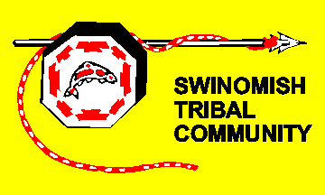 The combination of ceremonial and animate symbols, the drum and the fish, alludes to the mythology and legends passed through generations of Swinomish - according to which the Indian and all living things had a common language and helped one another in their struggle through life. The flag uses the four traditional colors of American Indian design - red, white, black, and yellow - which carry significant multiple meanings [see Miccosukee].