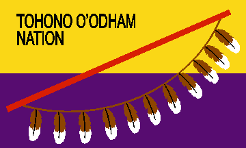 The flag of the Tohono O'odham reflects their reservation's topography and flora in a simple but effective way. The main element of the flag is the bicolor of yellow over purple (sample flag provided by "The Turquoise Turtle", Sells,