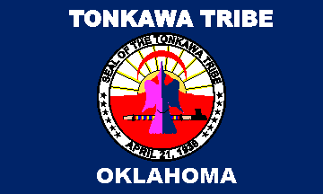 The Tonkawa's flag is royal blue. It bears the seal of the Tonkawa in the center and has TONKAWA TRIBE written in white across the top and OKLAHOMA, also in white, across the bottom (Homer Miller Co., Oklahoma City, OK).