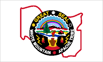 The flag is white, placing the tribal seal on a red outline map of the reservation (photo provided by All The King's Flags, the Phoenix, Arizona, manufacturer of the flag sometime after 1990). Within the seal a rainbow rises against a pale blue sky over a landscape and an elk stands by a river near a wikiyup. In the distance are snow-capped mountains while nearer, at the base of the seal, is a pine forest. An earthen Apache vase in the foreground is flanked by two feathers of red and yellow and a pair of lightning bolts in yellow near the outer edge of the seal.