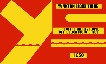 When printed as a logo or seal, three legends are added to the flag design. Above the first yellow bar is added a yellow stripe with "YANKTON SIOUX TRIBE"; across the center of the right end a second yellow bar appears with "Land of the Friendly People of the Seven Council Fires"; toward the base of the right end a short yellow bar reads "1858". All these inscriptions are in black. On the flag, the writing appears directly on the flag’s red background without the extra yellow bars.