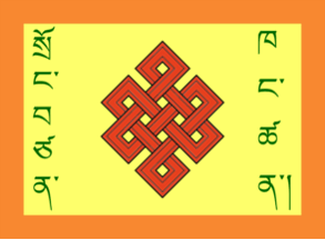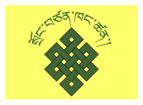 The Songtsen flag has a yellow field and shows a green endless knot (which is orange on the small flag).